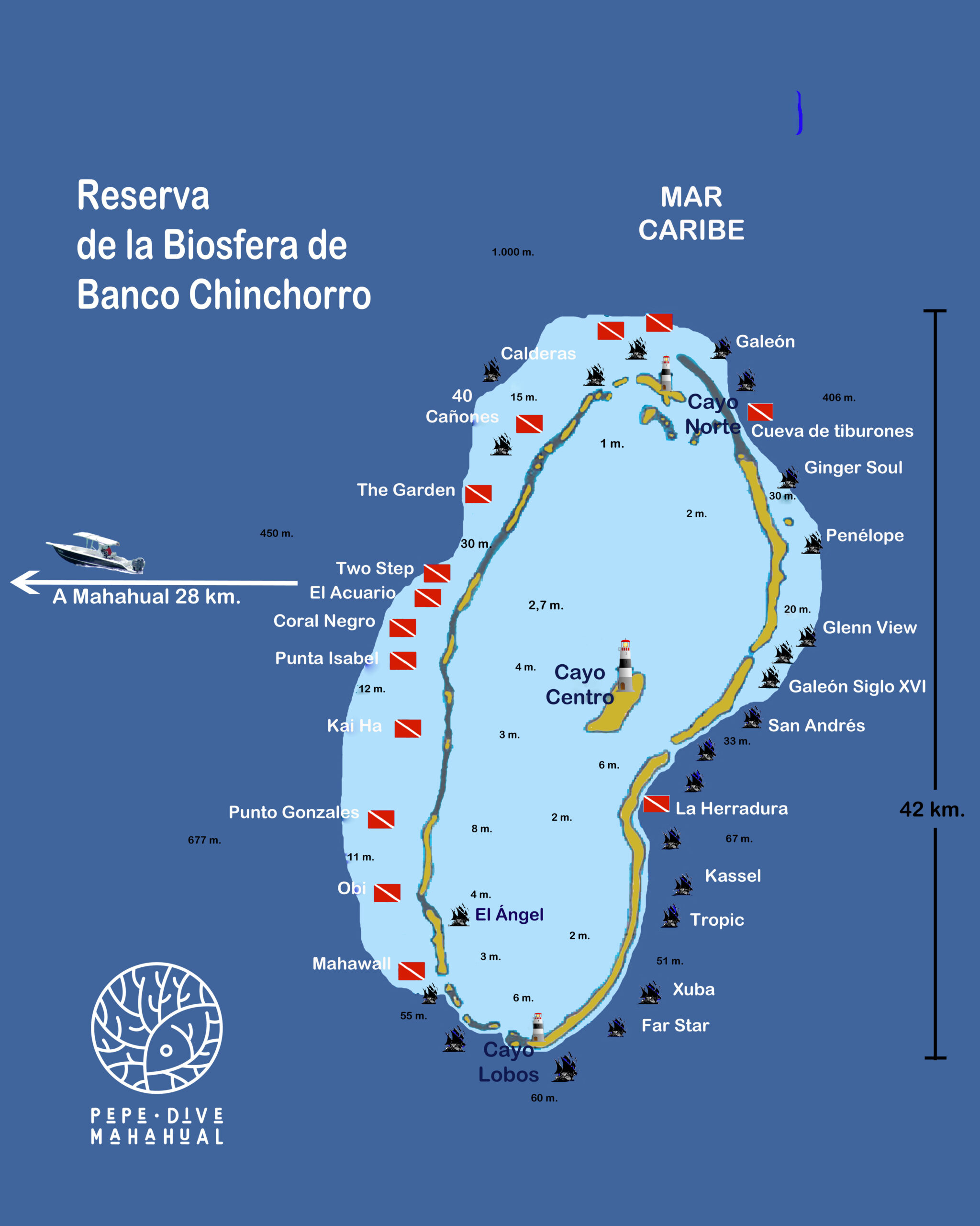 Solo hay unas poquísimas embarcaciones en Mahahual que tienen permiso para operar en la Reserva de Chinchorro. Pepe Dive Mahahual pertenece a la Cooperativa Turística Paraísos del Caribe que tiene dos de esas embarcaciones que alternan sus viajes en función de las necesidades, una de ellas, la Gran Kraken, con una capacidad de 20 personas, es las mas grande y confortable de las que operan en el atolón.